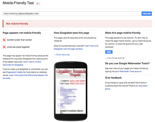 As an SEO company in St Louis that designs on the Joomla CMS we assumed that because our sites are designed to be mobile-friendly we wouldn't have any issues with the new update. However, we were surprised to learn that Google didn't see it that way. Running a mobile-friendly test revealed unexpected “Content wider than screen” and “Links too close together” errors.
